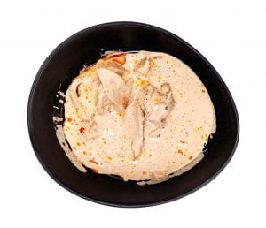 georgian cuisine – top view of Satsivi (spicy cold appetizer from poultry in walnut sauce) in black bowl isolated on white background